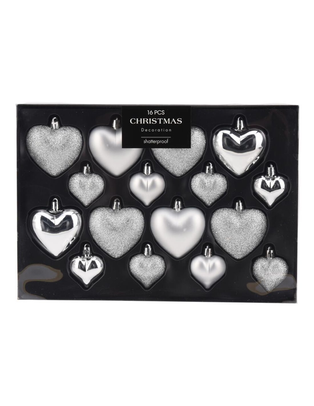 Το σετ χριστουγεννιάτικων στολιδιών περιλαμβάνει 16 τεμάχια σε σχήμα καρδιάς, σε 3 διαφορετικά σχέδια και ασημί χρώμα. Το σετ περιέχει δύο διαφορετικές διαστάσεις 6,5x0,8εκ. - 4,5x0,8εκ. , προσφέροντας ποικιλία στη διακόσμηση του δέντρου. Οι ασημί αποχρώσεις τους δίνουν μια λαμπερή και γιορτινή αίσθηση, ενώ τα διαφορετικά σχέδια και μεγέθη προσθέτουν βάθος και ποικιλία στο στολισμό, κάνοντας το δέντρο να ξεχωρίζει με κομψότητα και λάμψη. Διαστάσεις συσκευασίας: 35x2,2x31εκ.