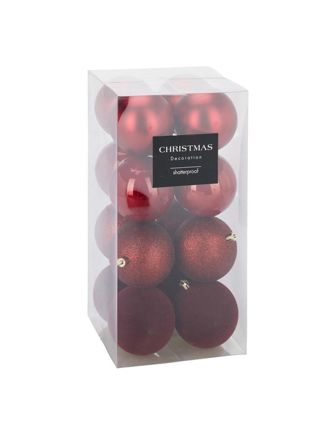 Σετ 16 χριστουγεννιάτικες μπάλες σε κόκκινη απόχρωση με τέσσερα διαφορετικά φινιρίσματα: ματ, περλέ, γκλίτερ και βελούδο. Με διάμετρο 8 εκ., προσφέρουν ποικιλία υφών και λάμψης που αναδεικνύει το χριστουγεννιάτικο δέντρο. Κατασκευασμένες από ανθεκτικό πολυπροπυλένιο, συνδυάζουν κομψότητα και αντοχή.