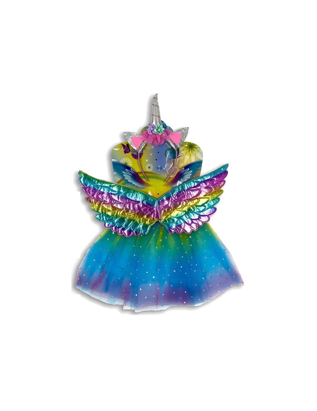 Σετ μεταμφίεσης μονόκερος σε αποχρώσεις του μπλε. Αποτελείται από το φόρεμα, στέκα και τα φτερά.