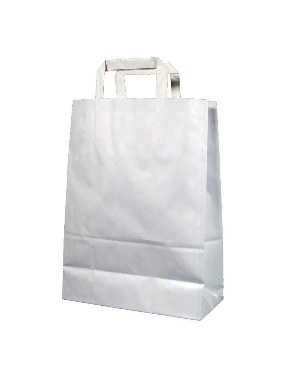 Χάρτινη τσάντα με πλακέ χερούλι. Σε άσπρο χρώμα. Διαστάσεις: Υ35x26x12εκ. Δυνατότητα προσωποποίησης για διαφημιστικό, δείτε φωτογραφία.