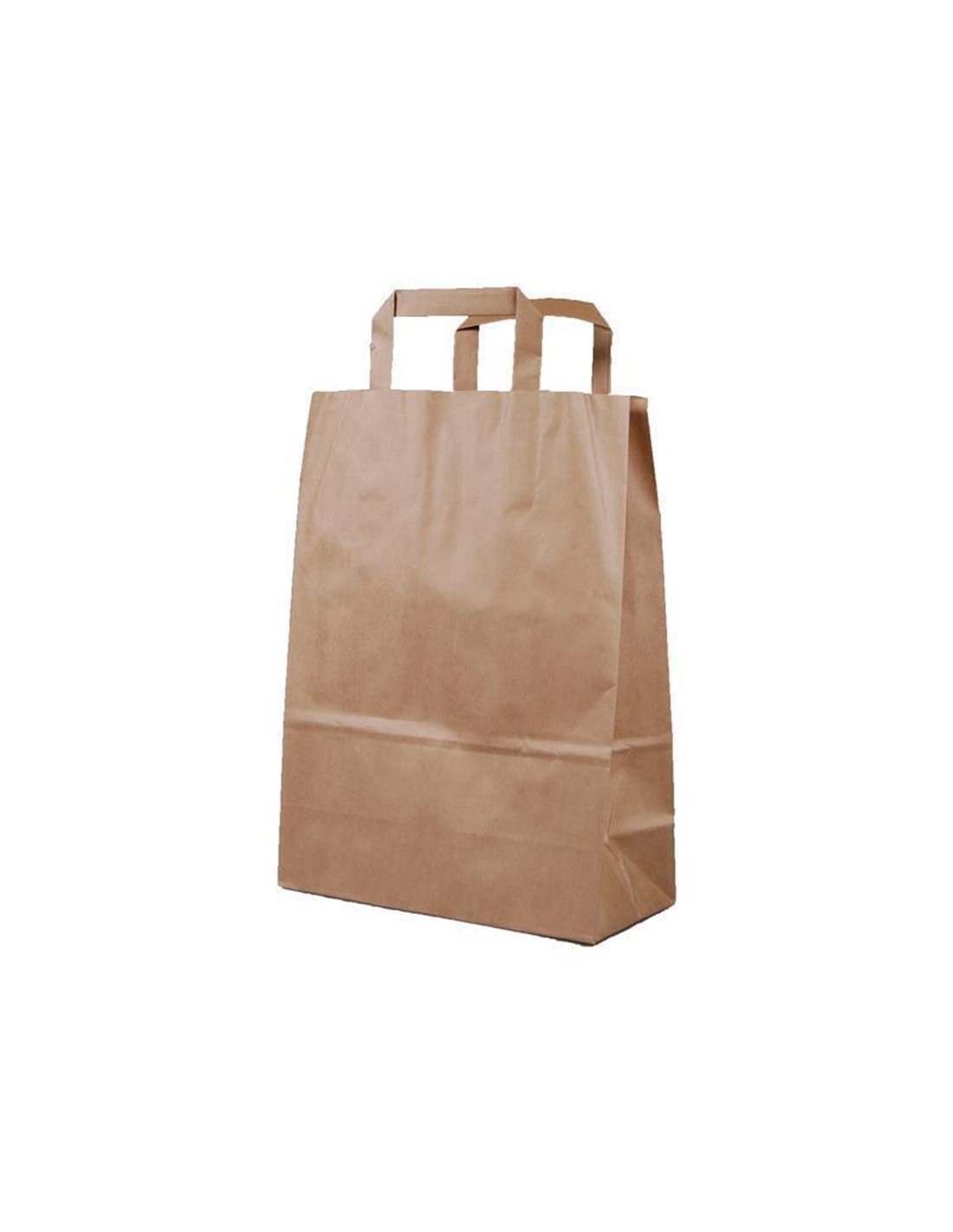 Χάρτινη τσάντα με πλακέ χερούλι από ανακυκλωμένο χαρτί. Σε καφέ χρώμα. Διαστάσεις: Υ35x26x12εκ. Δυνατότητα προσωποποίησης για διαφημιστικό, δείτε φωτογραφία.