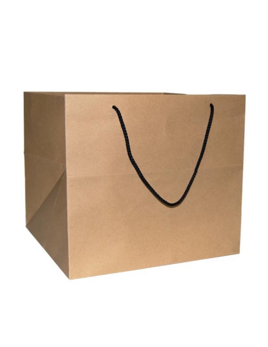 Χάρτινη τσάντα κραφτ με κορδόνι. Με μεγάλη αντοχή στο βάρος. Με μεγάλη τετράγωνη βάση 33x33εκ., κατάλληλη γιια ογκώδη αντικείμενα (πιάτα, κατσαρόλες, παιχνίδια, τούρτες κ.α.) Διαστάσεις: Υ29x33x33εκ Από χαρτί κραφτ 120γρ.