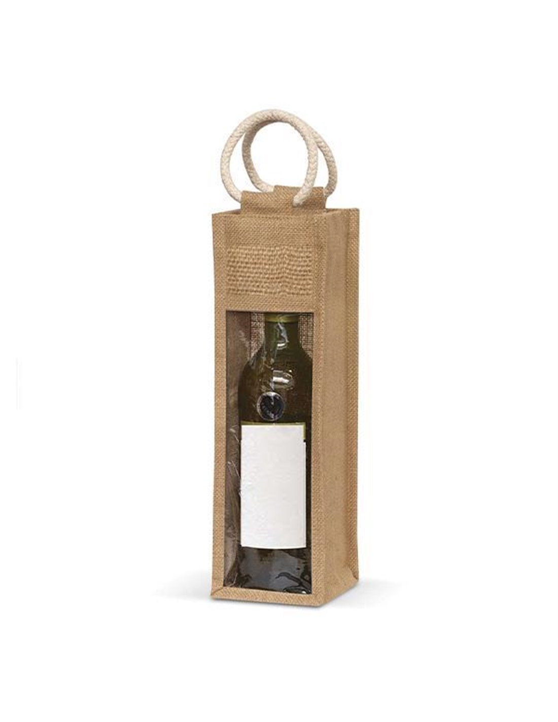 Τσάντα για μπουκάλι από φυσική γιούτα με παράθυρο από pvc. Τέλειες τσάντες για τη μεταφορά μπουκαλιών. Διαθέτουν ραφές άριστης ποιότητας που τους παρέχουν επιπλέον αντοχή, ενώ εσωτερικά η πλαστικοποίηση του υλικό δίνει επιπλέον προστασία από την υγρασία. Ιδανικές και για διαφημιστική χρήση, με δυνατότητα εκτύπωσης του δικού σας λογότυπου. Ζητήστε ειδική τιμή. Διαστάσεις: 11x10xY35εκ.