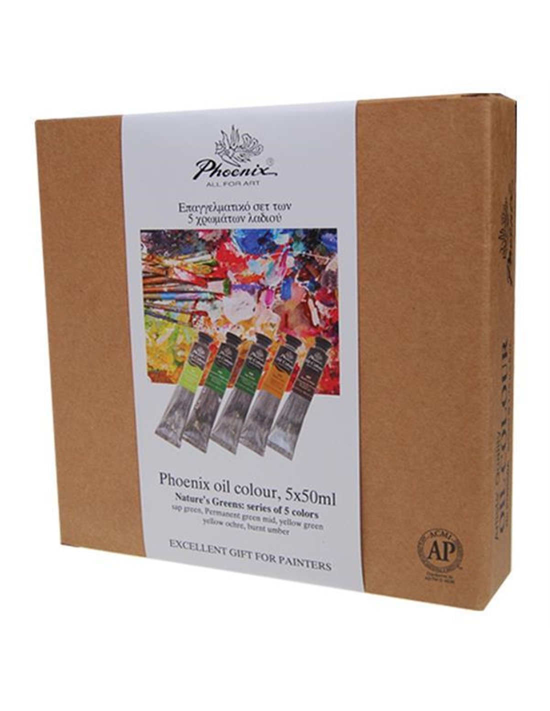 Σετ 5 βασικών χρωμάτων λαδιού σε πράσινες αποχρώσεις Phoenix (50ml /τεμ.). (sap green, PermanentGreen mid, yellow green, yellow ochre, burnt umber). Κατάλληλο για επαγγελματίες και ερασιτέχνες ζωγράφους.
