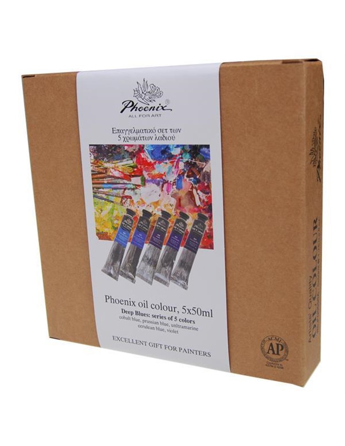 Σετ 5 βασικών χρωμάτων λαδιού σε μπλε αποχρώσεις Phoenix (50ml /τεμ.). (cobalt blue, prussian blue, unltramarine, cerulean blue, violet). Κατάλληλο για επαγγελματίες και ερασιτέχνες ζωγράφους.