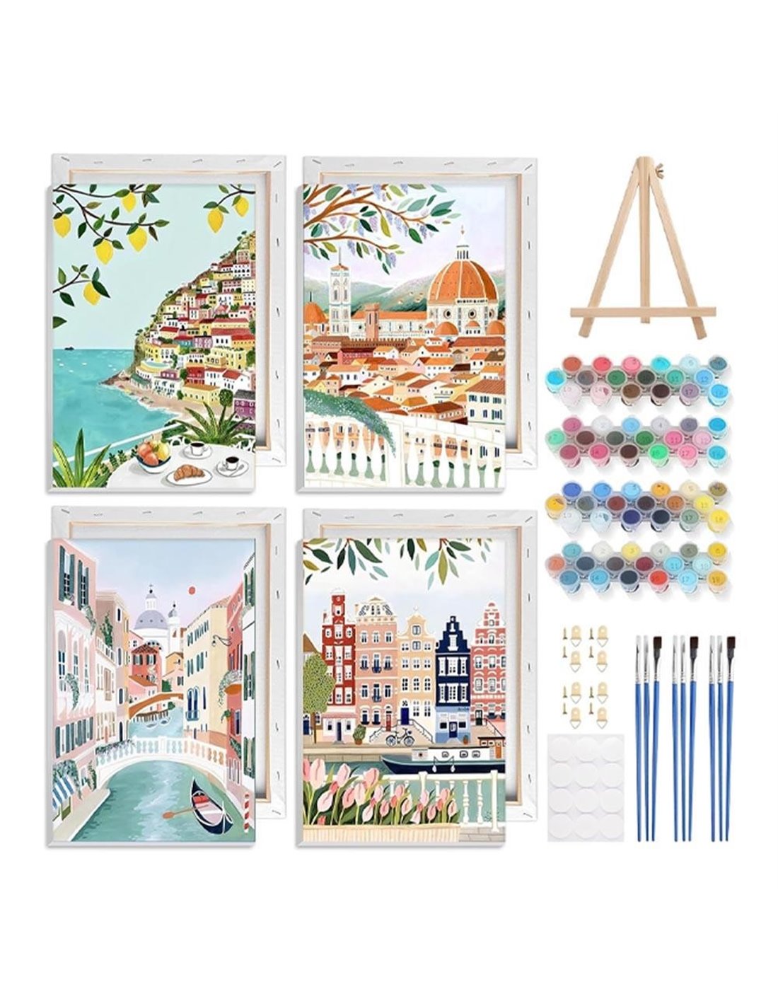Δημιουργικό σετ ζωγραφικής με αριθμούς για ενήλικες και παιδιά, με θέμα πόλεις και στιγμές ταξιδιού. Ιδανικό για όσους αγαπούν την τέχνη, τα ταξίδια και τη διακόσμηση. ✅ Περιλαμβάνονται 4 καμβάδες με αριθμημένα σχέδια ✅ Ξύλινη βάση/καβαλέτο για στήριξη έργων ✅ Πλήρες σετ με πινέλα και 48 αριθμημένα ακρυλικά χρώματα ✅ Με κορνίζα, έτοιμα για κρέμασμα ή τοποθέτηση ✅ Ιδανικό για αρχάριους και προχωρημένους ✅ Κατάλληλο για παιδιά άνω των 8 ετών - ενήλικες • Διάσταση καμβά: 20x30εκ.• Περιλαμβάνονται άγκιστρα, ταινίες - δίσκος ανάμειξης • Υλικό: καμβάς + ξύλινη βάση/καβαλέτο + ακρυλικά χρώματα