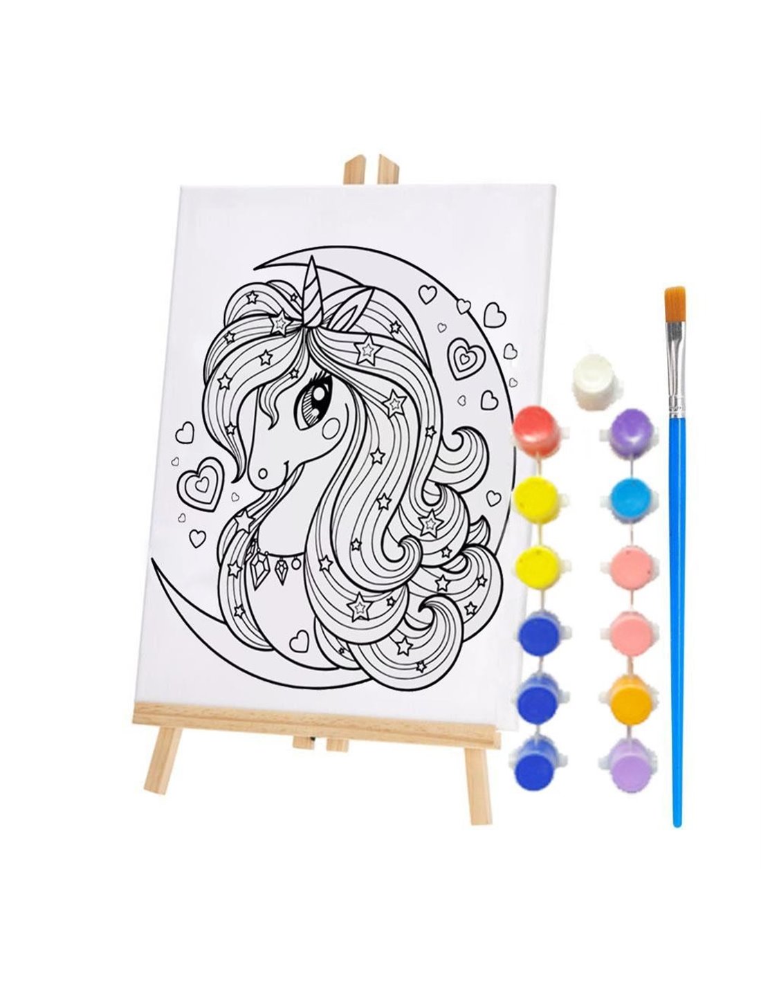 Πλήρες σετ ζωγραφικής που περιλαμβάνει καμβά 30×40εκ., ξύλινο καβαλέτο 48εκ., 13 χρώματα των 3ml και πινέλο. Ο καμβάς διαθέτει προσχεδιασμένα σχέδια για εύκολο και διασκεδαστικό βάψιμο, κατάλληλο για παιδιά και αρχάριους. Ιδανικό για δημιουργική απασχόληση στο σπίτι, το σχολείο ή ως δώρο. Διαστάσεις προϊόντος: 30×40×48 εκ.